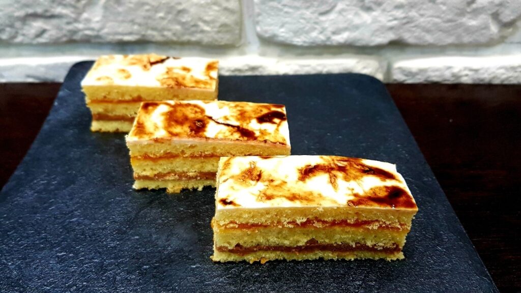 Полуфабрикат масляного бисквита с приятным карамельным цветом поверхности и внутренней структуры, обладает вкусом молочной карамели (тоффи).