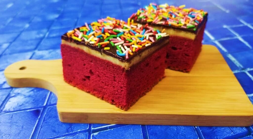 Лаконичное изделие на основе нежного вишневого бисквита в стиле «Красный Бархат» (Red Velvet), покрытого тонким слоем заварного молочного крема и шоколада.
