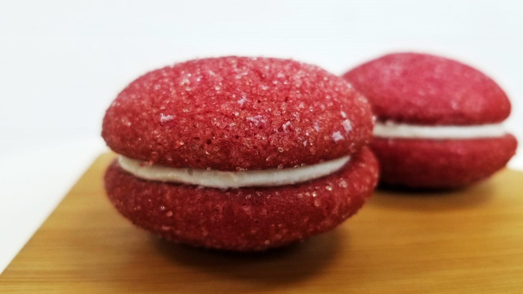 Оригинальное и популярное мягкое печенье «Вупи пай» (Whoopie pie) с вишневым вкусом в стиле «Красный Бархат» (Red Velvet). Рекомендуется подавать с кремовой прослойкой.