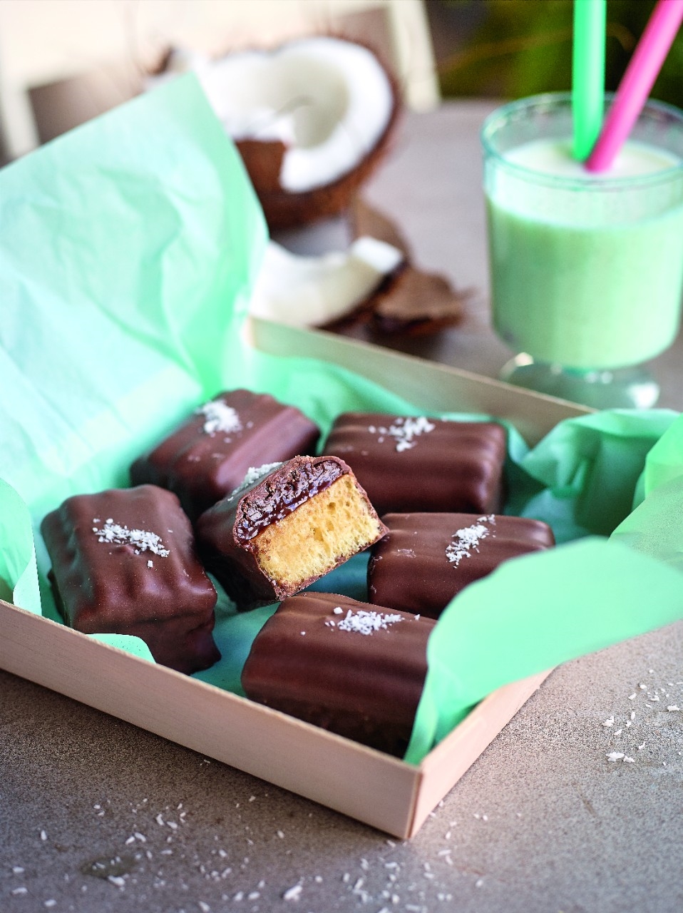 На один выпечной полуфабрикат высотой 1,5 см и длинной 3 см отсадить через кондитерский мешок с плоской насадкой Кремфил Ультим темный шоколад. Карат Каверлюкс Милк растопить до t 35-40°C и облить/окунуть каждую заготовку в глазурь. Сверху посыпать кокосовой стружкой.