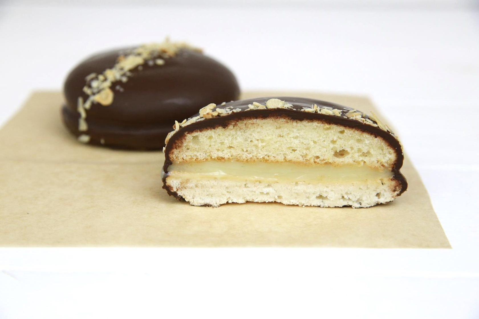 Новое комбинированное печенье, представляющее себе сэндвич с половинками, обладающих разными структурами: воздушной тянущейся; нежной бисквитной, прослоенных банановой начинкой.