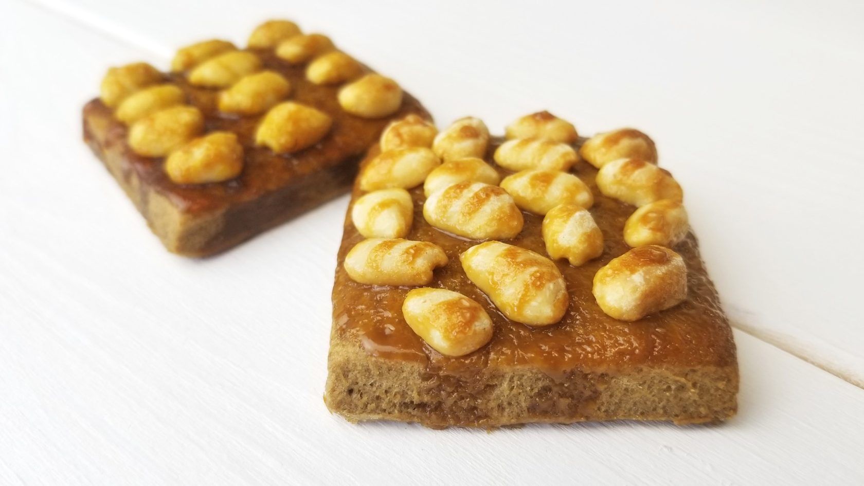 Тесто раскатать толщиной 1см, смазать мягкой карамелью или гелем холодного приготовления с карамельным вкусом. Затем нарезать на заготовки размером 5*5см и выложить ядра арахиса. Для заготовок понадобится около 530 г половинок ядра арахиса и 300 г мягкой карамели.
